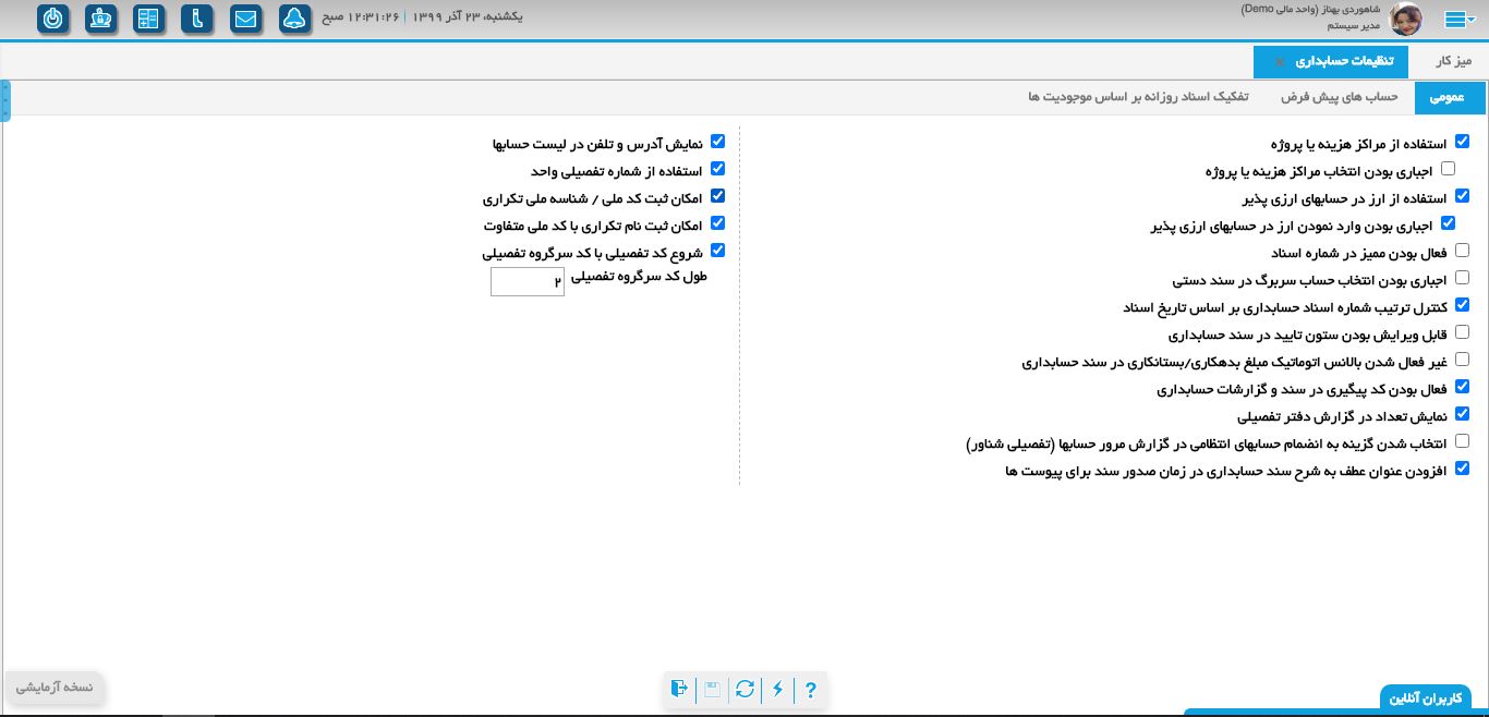ماژول حسابداری با ویژگی های پیشرفتهای که ارائه می دهد، به سازمان ها امکان می دهد تا فرآیند های مالی خود را با دقت و انعطاف پذیری بالاتری مدیریت کنند. یکی از ویژگی های برجسته این ماژول، چیدمان کدینگ حسابها در شش سطح است که امکان تفکیک و دسته بندی دقیق حسابها را فراهم می کند. همچنین، با امکان تعریف سرگروه تفصیلی و انتصاب چندین سرگروه تفصیلی به یک حساب معین، کاربران می توانند ساختار حساب ها را به صورت پیچیده و تخصصی تری تنظیم کنند.